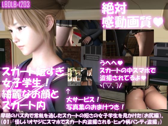最新の3DCG技術を駆使して限界まで写実的な動画を制作してみました。素晴らしいエロさの作品になっております。女子学生の一ノ瀬廻里が怪しいサラリーマン風のオヤジにバス内でスマートフォンを使ったスカート内盗撮の被害に遭っている様子(第三者視点)と、その戦利品のパンチラ動画のセットです。是非ひとつお手にとってお楽しみ下さい♪