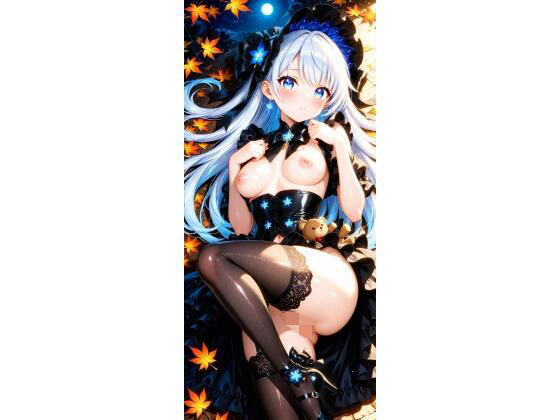 神秘的な青の光に照らされ、微笑むゴシックドールの様な少女。どこか儚く、どこか力強い、二つの魅力が詰まったイラストレーションです。
