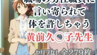 同僚のぽっちゃり系男性職員に体を触られ・・・すっかり発情してしまい図書館でやってしまう新任の久◯子先生!というイメージです。セリフはありませんが、ささやかながらのストーリー仕立てではあります。収録内容は愛撫 > フェラ > 口内射精 > 尻コキ > 射精 > 立ちバック(少し側位)> 中出し > 正常位 > 中出し です!png形式の画像をzipファイルでダウンロード可能です。※修正してはいますが、細かく見ると多少の破綻が見られる画像も含まれます。ご了承の上ご購入いただけますと幸いです。※意味のない日本語が出てきますが、雰囲気作りと思って大めに見てもらえればと思います※出てくるキャラクターは成人している設定です