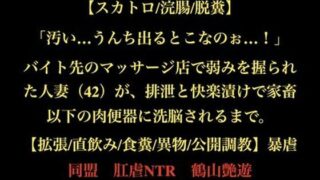 【d_727960】【スカトロ/浣腸/脱糞】「汚い…うんち出るとこなのぉ…!」バイト先のマッサージ店で弱みを握られた人妻(42)が、排泄と快楽漬けで家畜以下の肉便器に洗脳されるまで。【拡張/直飲み/食糞/異物/公開調教】【暴虐同盟】