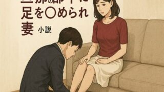 メイン登場人物妻 宮前由紀恵。34歳。結婚7年目。身長160cm、体重52kg。Gカップ夫 宮前正樹 37歳。息子 陸斗 〇〇。「夫、宮前正樹視点のお話です。宮前由紀恵の心理描写も含まれます。」私はちょくちょく同僚や部下、上司や友人を自宅に招く事がある。妻の由紀恵も最初こそ嫌がっていたが、今では普通に受け入れている。一緒に食事したり、テレビを見たり、時には酒を飲んだりもする。特に最近は息子がいるからか、頻繁に家に人を呼ぶようになった。息子は早めに寝てしまうので、夜の時間は私と妻と客人で楽しむ事が多くなった。お酒が入り時間帯も夜なので、もちろんそういった方向の話になる事も少なくない。最初は微妙な反応な妻だったが、最近ではむしろ積極的だった。私はそんな中でたまにいけない妄想をしてしまう時がある。妻が他の男に抱かれてよがっている姿を……。私の中の性欲がそうさせるのか、はたまた寝取り趣味なのか自分でも分からない。でももしそれが現実になったらと思うと興奮せずにはいられないのだ。その日は会社終わりに最近異動してきた部下の石川 康宏を自宅に招く事になっていた。彼は若いながらも仕事熱心で、好青年だ。他の同僚等と軽く飲み、私は石川を連れて自宅へと戻った由紀恵「おかえりなさいあなた。」玄関を開けると、由紀恵が出迎えてくれた。正樹「ただいま、今日は後輩連れて来たよ。」そう言って後ろにいる石川を紹介する。石川「はじめまして、石川と言います。お邪魔します。」由紀恵は微笑みながら会釈する。由紀恵「いらっしゃい、ゆっくりしていってね。」リビングへ案内し、飲み物を出してから私も席に着く。そして、いつもの様に雑談が始まるのだった。正樹「もう陸斗は寝たの?」由紀恵「えぇ、ついさっきね。お風呂入った後だから今はぐっすり寝てるわ。」石川「僕の子供の時なんて深夜の2時まで隠れてゲームしてましたよ。笑」そんなたわいもない会話が続いた。しばらくすると、お酒も回り始めほろ酔い気分になってきた。石川をよく見ると少し息が荒いように感じた。もしかしてと思い、テーブルの下を確認すると彼の股間部分が盛り上がっていた。「こいつ、まさか由紀恵で勃ってるのか?笑」そう思い、私はあえて気付かない振りをしてやり過ごす事にした。それから30分程経過しただろうか、話題も尽きてきた頃だった。石川がトイレに行くと言って席を立った。その時、私はすかさず由紀恵に耳打ちをする。正樹「あいつ、お前の身体見て興奮してるみたいだぞ。どうする?笑」由紀恵「えっ!?こんなおばさんの身体見ても仕方ないわよ!笑」正樹「男はお前ぐらいの年齢が一番興奮するんだよ。」由紀恵「そうなの……?」正樹「あぁ、間違いない。なんなら試してみるか?笑」由紀恵「何言ってんのよ・・・」妻は少し恥ずかしそうだったが、まんざらでもない様子だった。そうして、彼が戻ってきた。そして話の話題は、誰しもが持っているであろう「フェチ」の話になった。私はよく妄想するのが好きだと打ち明ける。私の中では、一番興味がある分野なのだ。特に妻が他人の手によって乱れていく姿なんか想像するだけで興奮してしまう。私はそんな変態的な事を平気で話していたのだが、意外にも妻は興味津々だった。そして妻と石川が自分のフェチについて語り始めた。石川「自分はやっぱり脚ですね。太ももとか、足裏とか、ふくらはぎとか……。あと、お尻も好きですよ!」正樹「脚っていうか下半身全般だな。笑」石川「そうなんですよ、上半身よりもまず下の方を見てしまいますね。」由紀恵「じゃあ、胸の大きさは関係ないのかしら?」Gカップの妻がそんなことを言うと、何か違和感があった・・・石川「いや、胸も大きい方が好きです!強いて言うなら奥さんくらいのサイズが良いです!!」由紀恵「えー、嬉しい事言ってくれるじゃない。笑」正樹(おいおい、なんで嬉しそうなんだ……?)石川「あと匂いにもこだわりがありますね!!」由紀恵「あー、分かる!!私も匂いフェチなのよね〜。汗の臭いとか嗅ぐとゾクゾクしちゃうの。」正樹「匂いフェチって、良い匂いが好きって意味じゃないのか?」私はてっきり女性の好きな香りの事だと思っていた。しかし、それは違っていたようだ。由紀恵「うーん、確かにいい匂いは好きだけど、それとは違うかな……。」どうやら妻が言うには違うらしい。妻はこう続けた。由紀恵「なんていうか、他人の体臭が好きというか、その人の体臭に興奮するのよ。」石川「そうそう、まさにそんな感じですよねー。」石川「あと自分は、女性の蒸れた足の臭いとか大好物なんです。あの独特のニオイが好きなんですよね!」正樹「無臭じゃダメなのか?」私は素朴な疑問を投げかけた。すると妻から意外な答えが返ってきた。由紀恵「ううん、むしろ無臭じゃ興奮しないかも・・・。」正樹「そうなのか!?」石川「そうなんすよねー。」私には理解できなかった・・・。そもそもなぜ